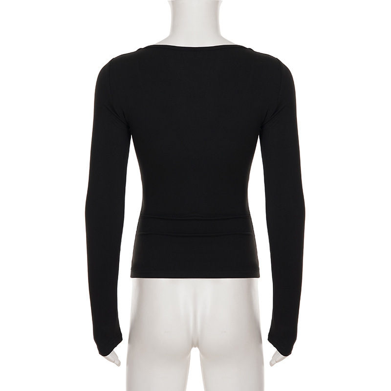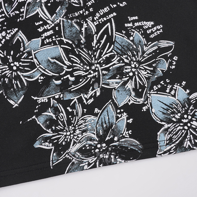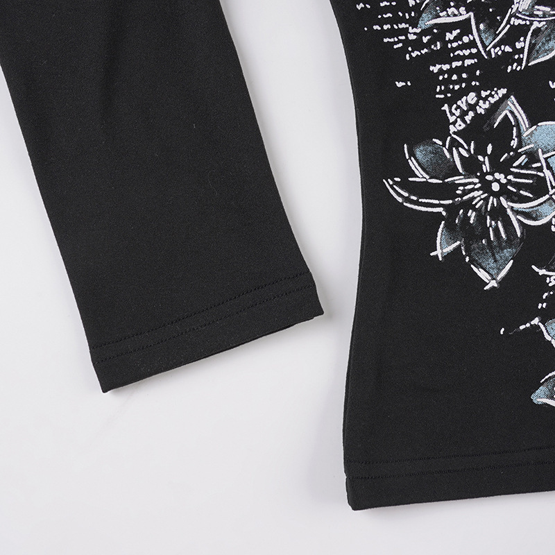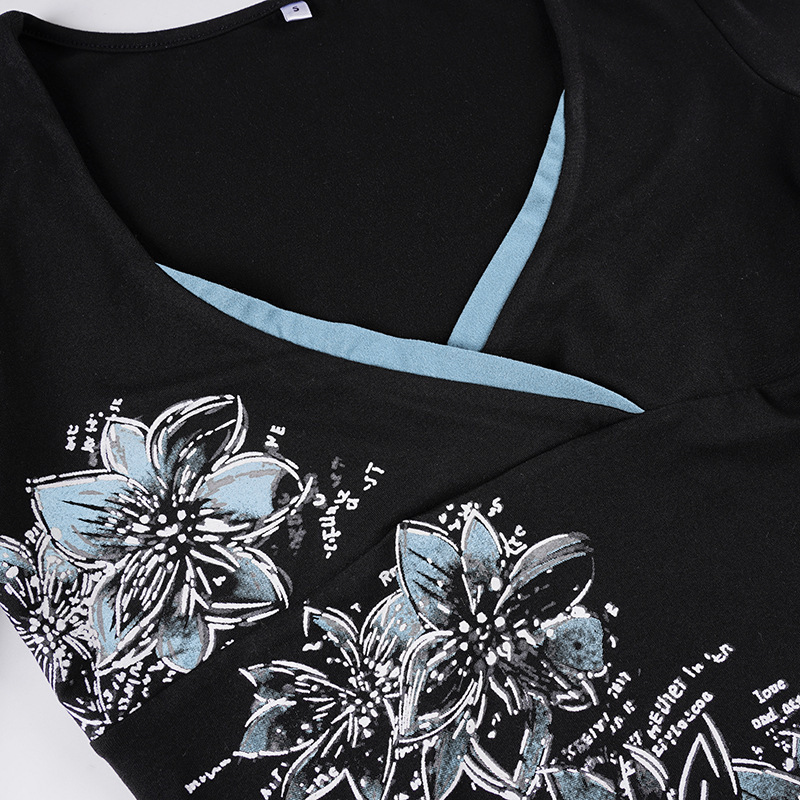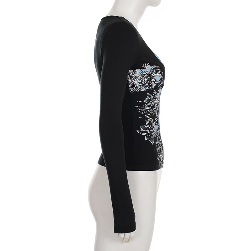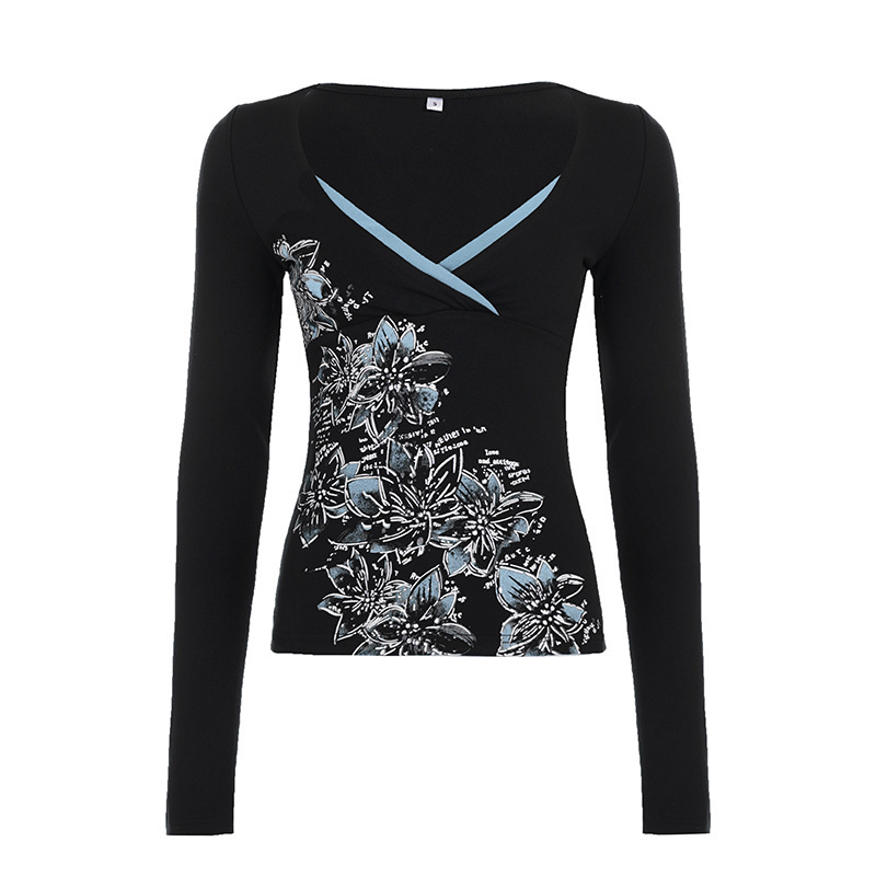 American Retro Plant Flower Print V Neck Slim T-Shirt Knitted Contrast Color Bottoming Shirt New Top